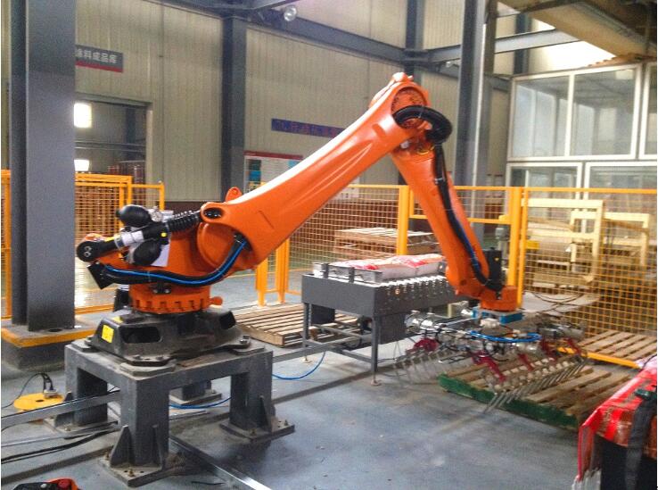 將產品通過進料輸送帶輸送進料,機器人及夾具到產品上方,抓取產品后移動到棧板位,按事先輸入的碼垛形式進行產品碼放。