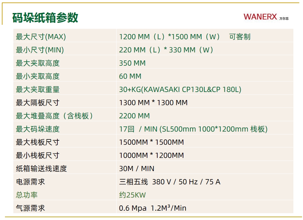 介紹:平板紙箱自動碼垛系統(tǒng)是萬爾芯的主打產(chǎn)品,其可根據(jù)客戶的場地需求、產(chǎn)能需求、及其他需求量身定制。 碼垛系統(tǒng)一般是由:機器人、疊包機、供棧機、鋪隔板機和四面拍齊機組成。其系統(tǒng)優(yōu)勢在于疊包和碼垛綜合到16-18次/分鐘。 產(chǎn)品別稱:紙箱碼垛機器人、紙箱碼垛機器、紙箱碼垛設(shè)備、全自動紙箱碼垛機、機器人紙箱碼垛、自動流水線紙箱碼垛機