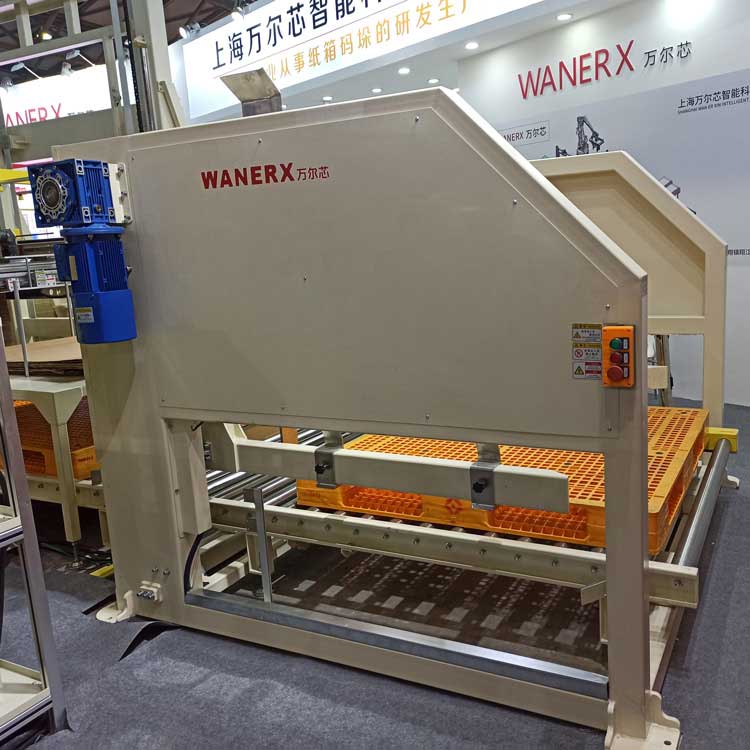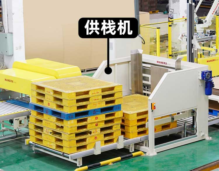 供棧機則是棧板分離機結構控制棧板掉落在鏈板輸送線上,分離機構成可根據棧板不同尺寸自動調整寬度,棧板分離后,經由鏈板線輸送至碼垛機器人處。